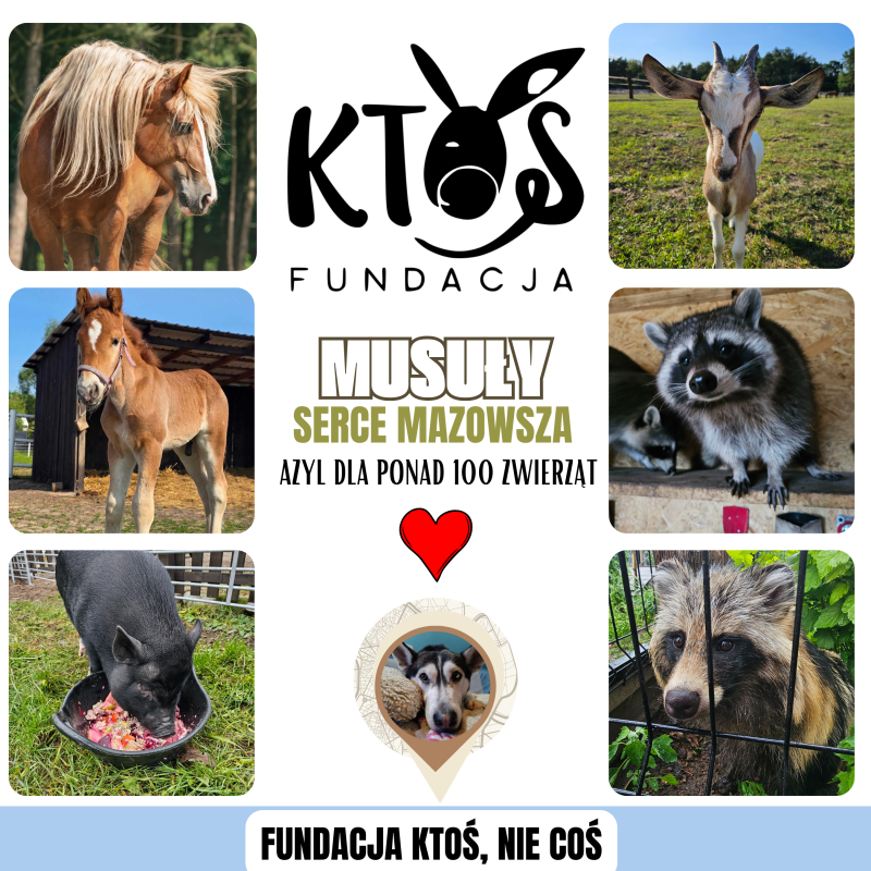 FUNDACJA KTOŚ, NIE COŚ działa na rzecz ochrony zwierząt oraz edukacji społecznej w zakresie empatii, odpowiedzialności i praw zwierząt. Prowadzi azyl Ktosiowo w Musułach przy ulicy Folwarcznej 3/5 (gmina Żabia Wola), gdzie opiekuje się uratowanymi zwierzętami gospodarskimi, domowymi i dzikimi. Reprezentuje zwierzęta przed sądami, reaguje na przypadki znęcania się, podejmuje działania interwencyjne i prewencyjne.