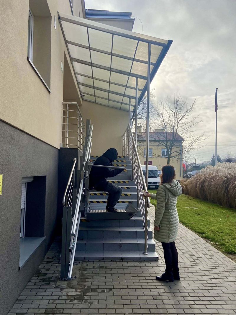 Wystarczy nacisnąć dzwonek przy wejściu — przeszkoleni pracownicy Sali Obsługi Mieszkańca zajmą się uruchomieniem platformy oraz pomocą w bezpiecznym wjeździe i wyjeździe z budynku.