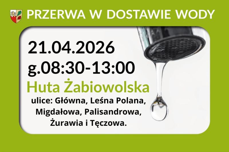 Zakład Gospodarki Komunalnej i Mieszkaniowej w Mszczonowie informuje, że w dniu 21.04.2026 r. w godzinach od 08:30 do 13:00 ze względu na prowadzone prace modernizacyjne nastąpi przerwa w dostawie wody w miejscowości Huta Żabiowolska, ulice: Główna, Leśna Polana, Migdałowa, Palisandrowa, Żurawia i Tęczowa."