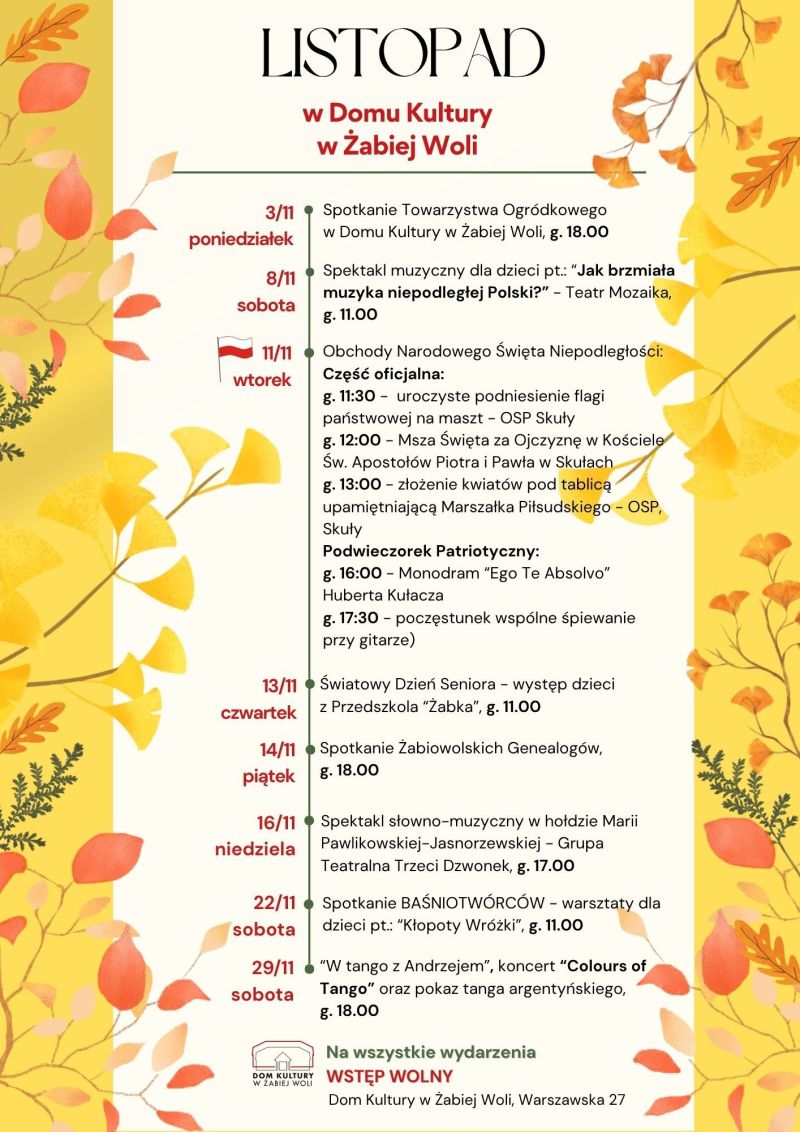Zapraszamy Mieszkańców do udziału w bezpłatnych wydarzeniach organizowanych przez Dom Kultury w Żabiej Woli w listopadzie - harmonogtram na załączonej grafice.