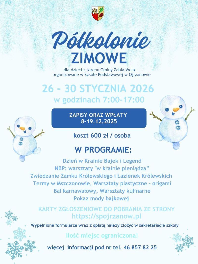 Zachęcamy do zapisów na półkolonie zimowe w Szkole w Ojrzanowie, które odbędą się w dniach 26-30 stycznia 2026. Zapisy oraz wpłaty w dniach 8-19 grudnia 2025. Koszt 600 zł od osoby.