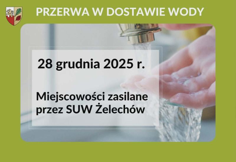 Informujemy, że w związku z awarią w Stacji Uzdatniania Wody w Żelechowie mogą występować niskie ciśnienie wody lub całkowity brak dostawy wody na sieci wodociągowej.