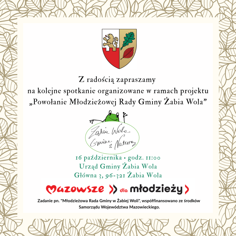 zapraszamy na czwarte spotkanie w ramach projektu „Powołanie Młodzieżowej Rady Gminy Żabia Wola, spotkamy się w 23 października 2025 r. (czwartek) o godz. 10:00 w sali konferencyjnej Urzędu Gminy Żabia Wola (ul. Główna 3, 96-321 Żabia Wola).