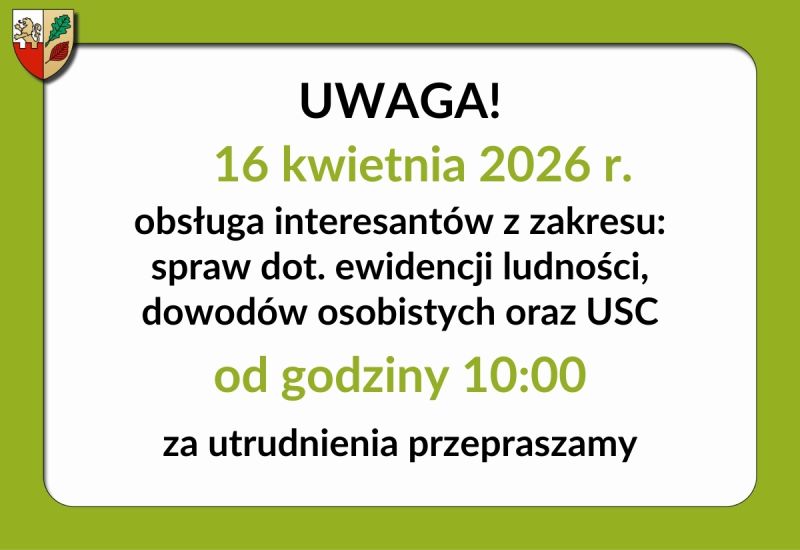 Informujemy, że w dniu 16.04.2026 r. Obsługa interesantów w zakresie ewidencji ludności, dowodów osobistych oraz Urzędu Stanu Cywilnego odbywa się od 10:00.
