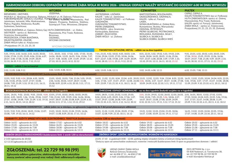 Informacja dla mieszkańców gminy Żabia Wola o nowym harmonogramie odbioru odpadów na 2026 rok oraz kluczowych zmianach w segregacji, które ułatwiają recykling i codzienne życie.